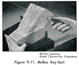 In order to track case studies, literature, field notes, I used a manual card sorting system, popular at the time, the Royal McBee key -sort. “Manual” being the operative term. A thin rod, similar to a knitting needle could separate notched cards into categories.